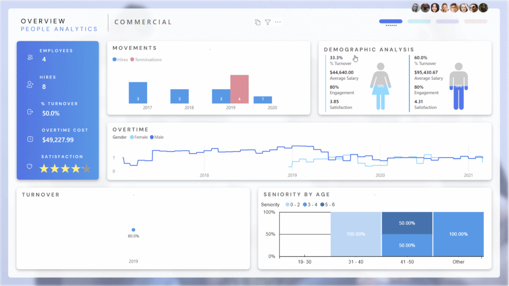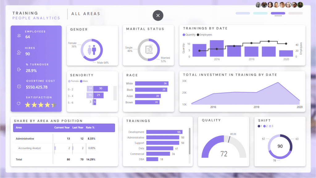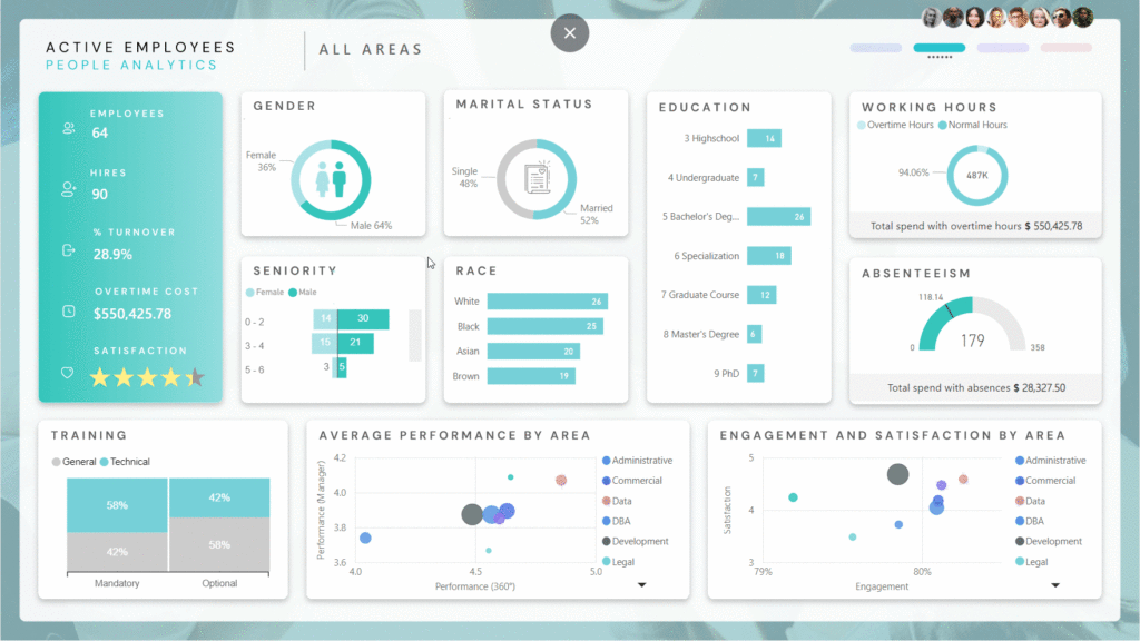 The days of managing high-performance teams and tracking these KPIs without the aid of technology are long gone. Questions like “How do we analyze the results of a training session?”, “Is it possible to quantify employee engagement and satisfaction?”, or “How does seniority relate to productivity?” are common. Fortunately, these can all be addressed through a single, well-structured report using a data visualization tool.